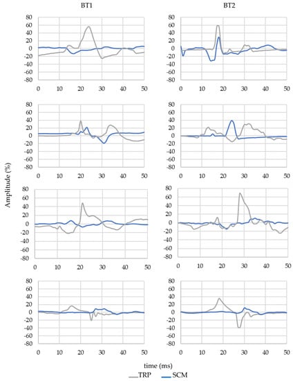 Figure 8 shows an example of the signals obtained from four different volunteers. The left column corresponds to the braking test 1 (BT1) and the right column corresponds to the braking test 2 (BT2). Moreover, the signal from both muscles is represented: the TRP response is represented in grey and in blue is the SCM response.