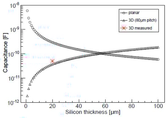In the planar geometry, the thinner the sensor, the higher the electrode‒to‒backplane capacitance, since it is inversely proportional to the thickness of the sensor, and thus the signal‒to‒noise ratio decreases. However, with the 3D geometry, the capacitance is two orders of magnitude lower than that of a planar sensor of the same thickness. Nevertheless, as the thickness increases, the 3D capacitance increases linearly with the thickness to match the planar case. This means that the 3D configuration is advantageous for thicknesses lower than 50 µm. An extensive simulation study of the electric behaviour of these detectors can be found in [].