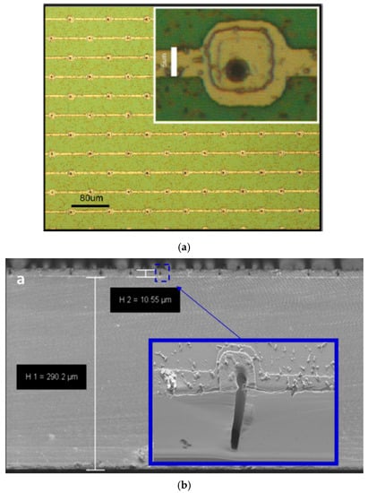(a) SEM image of the cross-section of one-unit cell, which was cut using a focused ion beam machine. Note that the radiation-sensitive volume is highlighted with a white outline in a cylindrical shape. (b) SEM image of an array of 3D microdetectors (15 μm diameter, 5.4 μm thickness), showing the metal strips ready to be connected to an appropriate readout electronics system. Images taken from [].