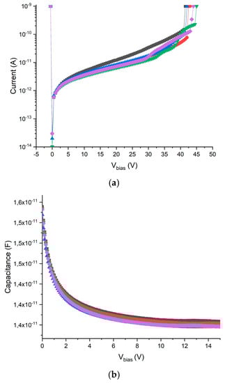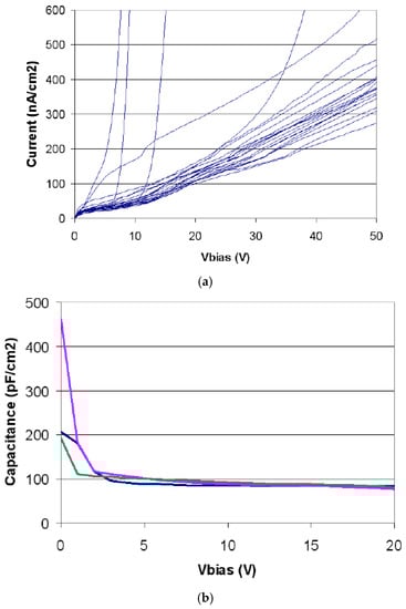 Figure 4 shows two representative electrical characterization current–voltage (I‒V) and capacitance–voltage (C‒V) curves: the leakage currents were in the range of 70 ± 10 nA/cm2 and the capacitances were in the range of 70 ± 10 pF/cm2 at 10 V (lateral depletion voltage at 5 V).