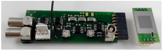 Photograph of the readout electronics: the portable electronics (left), measuring 10 cm in length, and a U3DTHIN (right) attached to an independent board, which can be connected to it. These separated boards allow the user to test different U3DTHINs with the same readout electronics. Image taken from [].