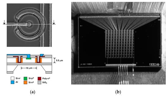 (a) Front face of a 3D‒cylindrical unit cell in the microdosimeter. (b) Photograph of a manufactured 11 × 11 microdetector array. On the top the upper fan-out connections directed towards the readout electronics are shown. On the bottom the lower part connects all of the rings surrounding the active areas to a common ground. Images taken from [].