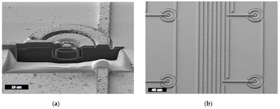 The three detector types (i.e., pads, strips, and pixel detectors) were fabricated. In all the configurations, n+ electrodes are connected together with metal lines to a n+ contact on one side of the sensor and arranged in a square matrix (e.g., 3 × 3 and 11 × 11 unit cells). Sensors were manufactured over SOI wafers measuring 6, 10, and 20 µm in thickness. The device silicon was <100>, n-type silicon doped with phosphorus and with a nominal resistivity >3 kΩ∙cm. The buried oxide and the support silicon thicknesses were 1 and 300 µm, respectively, for all wafers. The fabrication process was more complex than for U3DTHIN detectors, but followed the same strategy. Details of the fabrication process, electrical simulation, and charge collection study for the two consecutive generations of these sensors are described elsewhere [,,,,,]. Figure 7 shows scanning electron microscope (SEM) images of an array of these 3D microdetectors once manufactured.