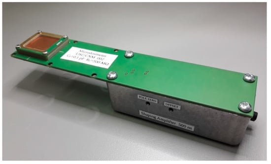 The e‒‒h+ pairs created by the charged particles over the sensor have to be amplified correctly once they are collected in the electrodes. This was done using a combination of a preamplifier, shaper, and amplifier electronics []. The preamplifier was configured as a current integrator to convert the current pulse at a voltage large enough to be treated and adapted with the minimum noise level possible. The subsequent CR high‒pass filter introduced the desired decay time and the RC low‒pass filter limited the bandwidth and set the rise time. These two filters attenuated the signal at high and low frequencies, where there was no useful information, improving the signal‒to‒noise ratio. ADA4817 (Analog Devices, Norwood, MA, USA) ultra-high speed voltage feedback amplifiers with FET inputs were used. Figure 5 shows the portable readout electronics powered at ± 5 V. This system was combined with a multichannel pulse height analyzer MCA8000A (Amptek, Bedford, MA, USA), connected from the experimental room to the control room to a PC via Ethernet with an ADMCA display and acquisition software. An energy calibration process was performed with either an injection of electronic pulse, which simulated the sensor output signal, or with alpha sources, e.g., 241Am and 238Pu. A response of 5 V/MeV in silicon was found using a pulse‒shaping stage with a time constant of 2.5 µs.