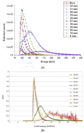 (a) Pulse height spectra versus the water-equivalent (P2251) thicknesses. Distributions were normalized to the fluence rate measured by a monitor chamber (104 p∙cm−2s−1). (b) Corresponding silicon microdosimetry spectra. Images taken from [].