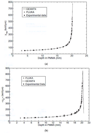 Similarly to the case above, the Bragg curve was obtained by interposing the same lucite wedge system with submillimeter steps between the beam and the detector. Microdosimetric spectra of the lineal energy were measured at different depths up to the Bragg peak. The results were then compared with Monte Carlo simulations using the FLUKA particle transport code, showing an excellent agreement between experimental and simulated microdosimetric distributions. The agreement between experimental data and simulations was evaluated using a gamma test. The gamma index values were lower than 1 overall []. Figure 12 shows the dose-averaged lineal energy comparison between the experimental data and the simulations.