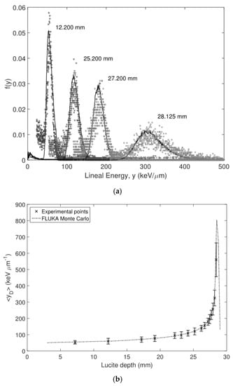 (a) Comparisons between the experimental and simulated lineal energy frequency distributions for different depths of PMMA across the Bragg curve. (b) Dose-averaged lineal energy comparison between the experimental data (crosses) and FLUKA Monte Carlo simulations (solid line). Images taken from [].
