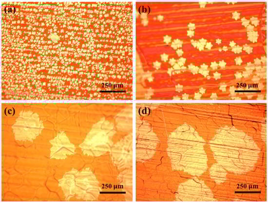The single-crystal graphene grown on the inner surfaces of copper pockets in the low-pressure environment presents a fractal structure resembling a snowflake []. Figure 1 shows the optical micrographs of single-crystal graphene grown at different growth pressures. Figure 1a–d are optical micrographs of single-crystal graphene grown at 3, 150, 300, and 450 Pa under 200-times magnification observation, respectively. It is shown that the size of single-crystal graphene increases and the nucleation density of graphene decreases with the increase in the growth pressure.