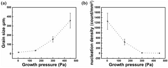 Nucleation density of graphene and size of single-crystal graphene at 3, 150, 300, and 450 Pa. (a) Relationship between growth pressure and size of single-crystal graphene. (b) Relationship between growth pressure and nucleation density of graphene.