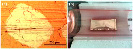 After finishing the growth of graphene, the copper pockets were opened to copper foils and the copper foils were placed onto a hot table at 200 for 5 min. The oxidized surfaces of copper foils were observed under an optical microscope. Due to the oxidation resistance of graphene [], the areas covered by graphene will not be oxidized, and the areas not covered with graphene will be oxidized to copper oxide. The areas covered by graphene were brighter than other areas. Therefore, we could directly observe the shape and size of single-crystal graphene on the copper foils with an optical microscope. An atomic force microscope (AFM) (Bruker, EDGE, Peabody, MA, USA) was used to acquire the inner surface morphology images of the copper pockets, and the corresponding surface roughness values were calculated.