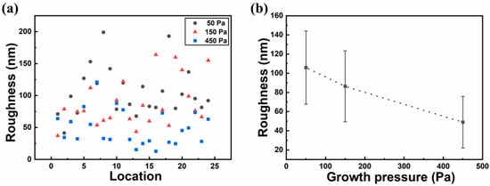 Statistical analysis of the variation of inner surface roughness of copper pockets with growth pressure. (a) The roughness values of 24 different locations on the inner surface of each copper pocket under 50, 150, and 450 Pa. (b) The relationship between growth pressure and the inner surface roughness of the copper pockets.