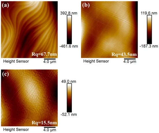 The nucleation density of graphene is closely related to the surface roughness of the substrates. The number of active sites on the uneven surface was higher, which increased the nucleation probability of graphene. Active sites are generally reported to be sites with higher surface roughness or covered by impurity or contamination on the surface []. Chen and her team were inspired by this point in their explanation for the principle of preparing single-crystal graphene with the copper pockets method in 2013. They found that when the copper in the inner surface evaporates, it redeposits on the inner surface and so no or little copper is lost (a small amount of loss of copper might occur at the open ends), and the inner surface was found to be much smoother than the outer surface in identical CVD growth conditions []. The dynamic balance of evaporation and deposition of copper inside copper pockets ensures the inner surface of the copper pockets smooth. Therefore, we further investigated the relationship between the inner surface roughness of the copper pockets and the growth pressure after observing that the nucleation density of graphene decreases with increase in growth pressure. The inner surface roughness of the copper pockets under different growth pressures was measured by atomic force microscopy (AFM).