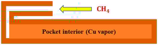 We also noted that the insides of the copper pockets are hollow. At the high temperature of 1030 , the copper will evaporate and there will be vapor pressure inside the copper pockets. When the copper pockets are in the low-pressure growth system, the copper vapor pressure generated by evaporation of copper inside the copper pockets will separate the upper and lower sides of the copper pockets at a certain distance. In the environment of high temperature and low pressure, we assumed that the copper vapor and in the copper pockets are ideal gases. After a period of growth, the pressure both inside and outside the copper pockets reaches an equilibrium. At this time, the pressure inside and the growth pressure outside the copper pockets are equal, . Figure 6 shows a schematic drawing of the cross-section of Cu pocket and shows the transport channel into the pocket interior environment. Hao and co-workers found the relationship between the number density of methane molecules in copper pockets and the time as (1) in 2016 [].