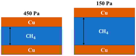 where R = 8.31 J/(mol·K), and because , R, and are constant, is inversely proportional to . When the growth pressure increases, the volume of copper pockets is smaller. Carbon source supply during graphene growth is also an important factor affecting the nucleation density of graphene []. The decrease in the volume of copper pockets can determine the content of methane in the copper pockets. As shown in Figure 7, compared with 150 Pa, the volume of the copper pockets stretched by the copper vapor pressure at 450 Pa is smaller, so the content of in the copper pockets will also be reduced. The decrease in carbon source supply will reduce the nucleation density of graphene and increase the size of single-crystal graphene. We think that this is the main factor that affects the nucleation density of graphene on the inner surfaces of copper pockets.