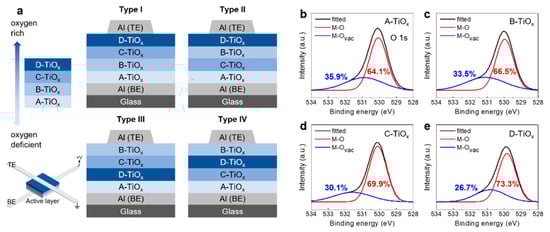(a) Schematic device structures of the memristors having four TiOx sub-layers with different oxygen vacancy (Ovac) contents. The stacking sequence of the TiOx sub-layers was varied (types I, II, III, and IV). The thicknesses of the A-TiOx, B-TiOx, C-TiOx, and D-TiOx films were approximately 14.0 nm, 11.5 nm, 11.5 nm, and 9.0 nm, respectively. The O1s spectra measured by using the X-ray photoelectron spectroscopy (XPS) for, (b) A-TiOx, (c) B-TiOx, (d) C-TiOx, and (e) D-TiOx films.