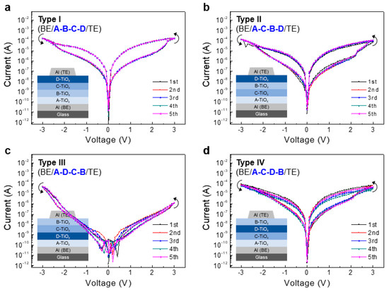 The representative current–voltage (I–V) characteristics of memristors having the stacking sequences of (a) A-B-C-D (type I), (b) A-C-B-D (type II), (c) A-D-C-B (type III), and (d) A-C-D-B (type IV), respectively. The top electrode (TE) was set as ground and the bias applied to the bottom electrode (BE) was swept in the sequence of 0 V → +3 V → −3 V → 0 V. The measurement was repeated five times in each case.
