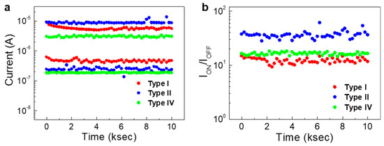 The data retention characteristics of memristors are important for realizing highly stable memory devices as well as neuromorphic or synaptic devices. Figure 3a shows the data retention characteristics of type I, II, and IV devices. Here, the LRS and HRS states were programmed with pulsed biases of +3 V and −3 V, respectively (pulse widths of 100 ms). Also, the programmed states were read for an interval of 200 s up to 10,000 s, with a read voltage of +1 V. As displayed, devices with types I, II, and IV showed stable operation up to 10,000 s without a considerable change in the current levels of ON (ION) and OFF (IOFF) states. Therefore, the ION/IOFF ratios are maintained correspondingly as shown in Figure 3b. Among the tested devices, the type II memristors exhibited the highest ION/IOFF ratio, while the type I memristor showed the lowest ION/IOFF ratio. Nonetheless, the results indicate that regardless of the stacking sequence, the TiOx-based memristors showed relatively stable operations.