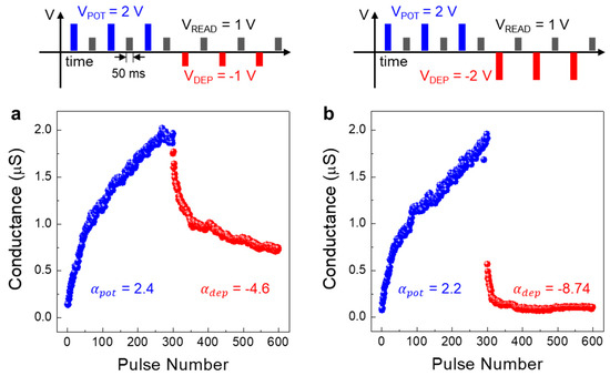 Symmetric synaptic weight update characteristics between long-term potentiation (LTP) and long-term depression (LTD) is a crucial factor in designing synaptic devices that directly affects learning accuracy of neuromorphic computing [32,33]. As shown in Figure 4, we measured the long-term plasticity of the type II device by applying a pulse train consisting of potentiation (VPOT), depression (VDEP) and read pulses. The VPOT was fixed at +2 V during the potentiation process while the VDEP was varied as −1 V and −2 V as shown in Figure 4a (“A” pulse train) and b (“B” pulse train), respectively. Each potentiation and depression was performed for 300 cycles each. The duration time of each pulse was 50 ms and the pulse interval was ~1.45 s (see the inset of Figure 4 showing the pulse train of the three cycles). As shown in Figure 4, bidirectional switching behaviour was obtained in which the channel conductance was set to various conducting states between 0.136 μS and 2.02 μS for both conductance rise and fall processes. The acquired channel conductance represents a non-volatile behaviour. Thus, increasing and decreasing the channel conductance can be regarded as synaptic LTP and LTD, respectively. In addition to the symmetry, the change in linear conductance between LTP and LTD processes is also an important factor [32,33]. So, we calculated the nonlinearity values between LTP and LTD processes through the potentiation and depression data. The nonlinearity factors (α) were extracted from the characteristic curves shown in Figure 4. We use the device behavioural model [34], where the conductance change is represented with the following equations [34]: