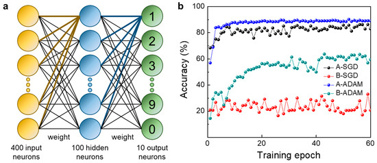 (a) A three-layer perceptron-based artificial neural network for Modified National Institute of Standards and Technology (MNIST) handwritten recognition, and (b) the accuracy with training epochs based on two pulse conditions and two algorithms which were stochastic gradient descent (SGD) and adaptive moment estimation (ADAM).
