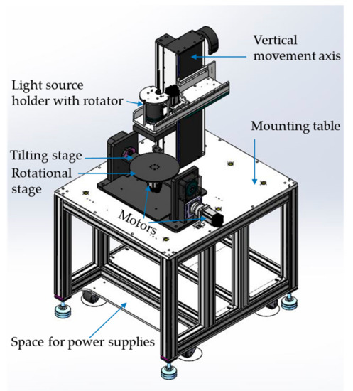 The process of lithography has advanced manifolds with the course of time. Researchers have presented their findings and suggestions from time to time that have enriched the process of photolithography. A lithography technique has been presented where a single step of polyurethane methacrylate (PUMA) coating and two steps of UV exposure have been used to create a microchannel [1]. Soft X-ray has been exploited for fabricating microstructures where the sweet spot is considered for getting higher resolution structures [2]. A type of microfabrication process employs stereolithography and electroplating which is applicable to polymer and metal microstructures as well [3]. A proximity mode inclined lithography process has been discussed where a certain gap in between the mask and the substrate is maintained and it can be used for both front side exposure and backside exposure [4]. For some Bio-MEMS applications, electron beam lithography (EBL) has been used which is able to get sub-micron feature sizes [5]. A method of multi-beam interference for fabricating 3D polymeric microstructures has also been discussed [6]. UV Lithographie, Galvanoformung, Abformung (LIGA) technology is another method of fabrication for fabricating high-resolution microstructures where Lithographie, Galvanoformung and Abformung are the German acronyms for lithography, electroplating, and molding respectively [7]. The current fabrication procedure followed by different research groups is more or less similar in their applications [8] but the difference lies mainly in the light source used for exposure, the substrate holder used for determining the exposure direction, or the material used for making microstructures. Mercury vapor lamps have been in use as the UV exposure light source for decades. Commercially available mercury vapor lamps that contain mercury and xenon gases are even able to fabricate several millimeter range micro-pillars that can be used in an inductor and more other applications [9]. However, the mercury-vapor lamp emits light with several wavelengths that need to be filtered out. Also, this light source needs high maintenance and has a limited lifetime. Nowadays, LEDs are considered to be a proper replacement for these traditional gas discharge lamps. With the recent advancement of UV-LEDs and the availability of various wavelengths, researchers are moving towards an easier and more convenient UV-LED light source exposure system [10,11]. It has also been demonstrated how a specific wavelength of UV-LED can be a good replacement for traditional UV lamps that contains multiple-wavelength peaks [12] and can achieve success in maskless photolithography as well [13]. However, these UV-LED light sources were controlled manually and exposure is allowed only in the vertical direction. Also, they emphasized only small feature size patterns and none of them were reported to be able to fabricate millimeter range microstructures or 3D microstructures. Whereas the light source discussed here was able to fabricate both millimeter range microstructures and complex 3D microstructures. Choosing the material suitable for microfabrication is another important step of photolithography. Although positive photoresists like novolac and diazonaphthoquinone (DNQ) are still in use; however, SU8 negative photoresist is more popular for research and applications nowadays. A wide range of robust microstructures is fabricated using SU8 [14,15]. Straight pillars can be obtained from straight exposure under the UV light source. However, a lot of complex microstructures are needed for different applications. That depends on how the substrate is held under the light source. A lot of methods are there to fabricate them. One of the methods exploits the simple photolithography procedure, where the sample is exposed from backside with different angles and multiple exposures around the axes give high aspect ratio 3D structures as output [16]. Several exposure methods have been discussed where the stage or exposure angle should be controlled manually, which consumes a lot of time and lacks precision. The layering effect caused due to less precise control of the stage leaves the structure with rough surfaces and defects. The multidirectional movement of the substrate greatly facilitates complex structure fabrication and smooth surfacing [17]. When this multidirectional movement is automated and computer-controlled, there is greater ability to fabricate complex 3D microstructures. Employing two independent motors for controlling the rotational and tilting movement makes it possible to produce a wider range of complex microstructures [18]. The dynamic mode multidirectional UV light source was another step ahead in making advanced 3D structures where nanoscale range structures were successfully demonstrated [19]. Whereas a traditional UV light source was used for this system and the user had no control over the light source nature or intensity. Recent advancement includes the use of multidirectional UV-LEDs as light source that does not require high maintenance and can be switched on and off in certain areas of the substrate [20]. Substrate holders for these systems were separately set up with the light sources. There was no integrated system for both the light source control and substrate holder control. The exposure system discussed in this article is comprised of the user controllable light source with higher intensity and an integrated tilt rotational substrate holder, as well as dedicated software to run the programs. Figure 1 shows the drawing of the discussed microlithography system drawn in SolidWorks CAD software. There is a light source holder with a rotator where an array of LEDs is mounted. This holder along with LEDs is able to move up and down on the vertical movement axis with the help of a motor. On the mounting table, a substrate holder is placed with tilting and rotational stages which are operated by two motors respectively