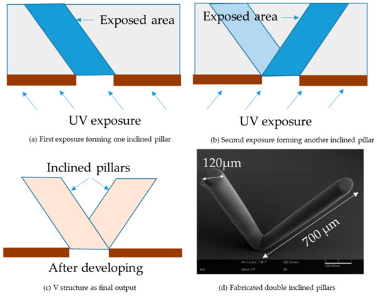 Fabrication procedure: (a) First inclined pillar formation; (b) Second pillar formation; (c) ‘V’ like double inclined pillars as output after developing; (d) SEM image of a ‘V’ structure fabricated using the UV microlithography system.