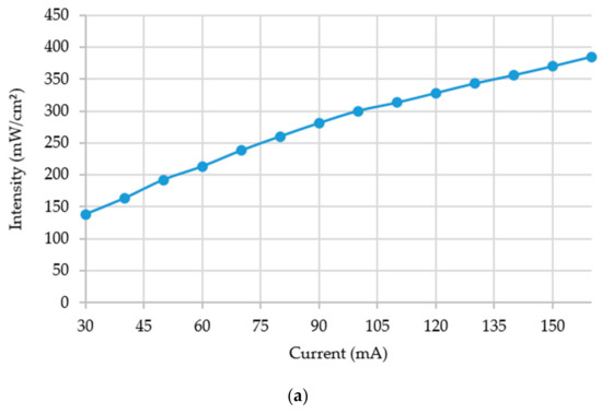 A variety of LEDs are available commercially. They are usually differentiated by wavelength, color, and other parameters. The unit of the exposure system that has been discussed here is an LED with a 5 mm diameter. This UV-LED emits light with a wavelength of 395 nanometers. The spectrum of this LED was analyzed by using an optical spectrum analyzer (BLUE-Wave, StellarNet Inc., Tampa, FL, USA). Figure 2a shows the graph plotted in MATLAB obtained from the spectrum analysis, where the x-axis represents the wavelength in the nanometer, and the y-axis represents the intensity measured in mW/cm². Half of the intensity bandwidth is covered in between the range of 390 nm to 410 nm. As the peak indicates a unique value at 395 nm with an intensity of 387.8 mW/cm², there is no necessity to filter out any other spectra. The inset of Figure 2a shows the 5 mm UV-LED which is the unit of the light source of this system.