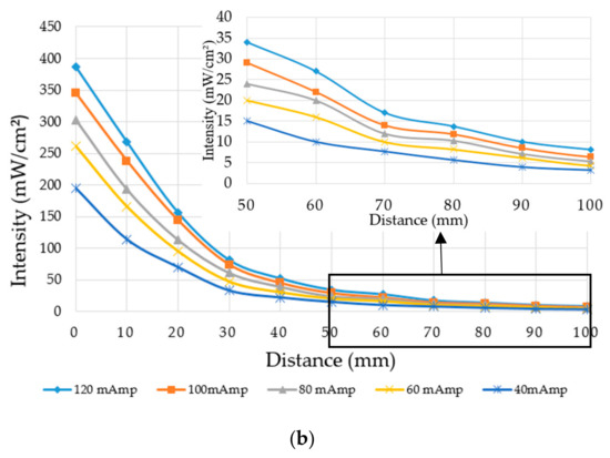 Figure 5a shows a graph demonstrating a linear relationship between intensity and DC current. The x-axis represents the DC current applied in milliampere whereas the y-axis gives the respective intensity in milliwatts per square centimeter. Figure 5b shows an exponential relationship between intensity and linear distance between the LED and the intensity meter. As the distance gets longer the intensity becomes less and less but strong enough to accomplish microlithography exposure. The inset of the figure shows the variation of intensity for further distances between 50 mm and 110 mm. A very significant intensity is observed even at such far away distances from the light source.