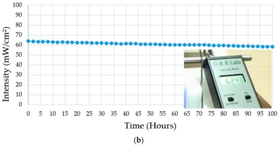 Long-time exposure is needed in order to get tall pillars and complex 3D structures. As a result, the light is required to keep turned on for several hours. So, the light should maintain a stable intensity for a long time. Figure 6a shows the setup for measuring light intensity over 100 h. In this job, a software named i-Spyconnect (2018) was employed to monitor and record the intensity for this whole time. The sensor of the intensity meter was placed above the light source.