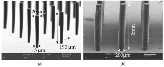 Versatility of the lithographic system: (a) 1:12 micro-pillars with 15 µm photo-pattern; (b) 1:10 micro-pillars with 200 µm photo patterns.