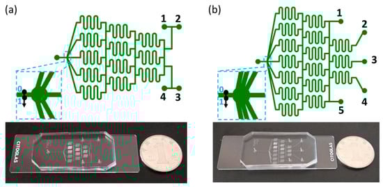 Schematic of the type IV (a) and type V (b) concentration gradient makers used in this work, and the corresponding experimental microfluidic chips fabricated with glass-polydimethylsiloxane (PDMS) by soft lithography and plasma bonding. Here, 1, 2, 3, 4, and 5 denote the five inlets.