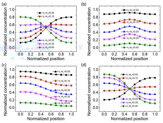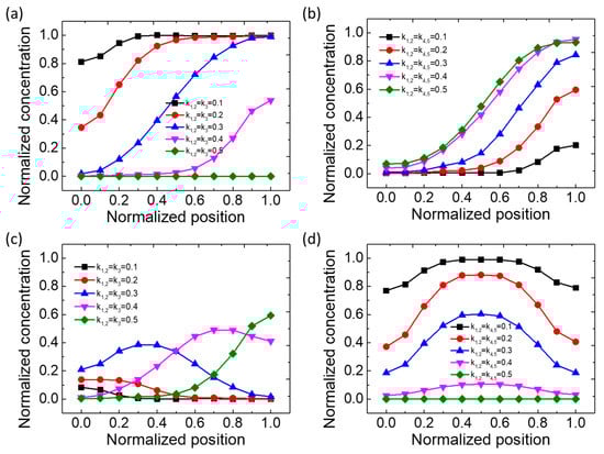 As shown in Figure 4a–d, the normalized concentration as a function of normalized position at the outlet of the microfluidic device was plotted. Here, the concentration matrix for Figure 4a,b is C = (0, 0, 0, 1, 1), and the concentration matrix for Figure 4c,d is C = (0, 0, 1, 0, 0). Compared with the type IV concentration gradient maker, the concentration gradient form generated by the type V device is more abundant and various. From Figure 4a, the normalized concentration is monotone, increasing against the normalized position, when k1,2 = k3 = 0.1, 0.2, 0.3, 0.4. With the increase in k, the initial value of the concentration gradient at the outlet decreases gradually, and the gap is large. When k1,2 = k3 = 0.5, only buffer solutions are fed, so the concentration is 0. However, when k1,2 = k4,5, with the increase in k, the concentration increases and the initial value is similar, but the final values present seemingly uniform differences, as shown in Figure 4b. Instead of going all the way to an allowed maximum value of 1, here, the normalized concentration shown in Figure 4c eventually reached a peak and decreased once more. Similarly, when the concentrations reached the maximum values defined by diffusion and convection, their quantities decreased with the channel width position, as shown in Figure 4c. With the increase in k, the position of the peak value moves to the right. The concentration profile shown in Figure 4d is similar to that shown in Figure 2b. However, the difference is that when k1,2 = k4,5 = 0.2 and 0.3, the concentration gradient has a relatively large dynamic range.