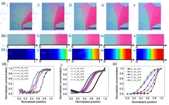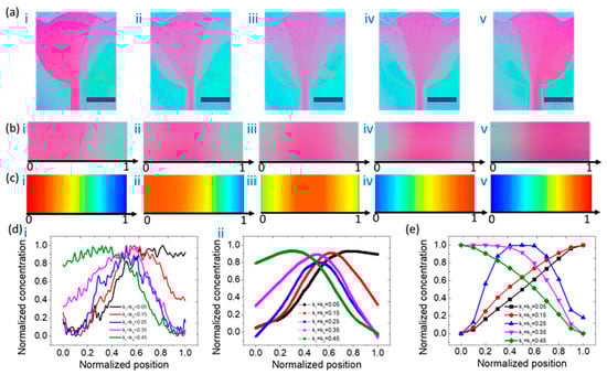 (a) Experimental results of the concentration distribution at the outlet of the microfluidic device. From left to right, i denotes the case of k1,2 = k4,5 = 0.1; ii denotes the case of k1,2 = k4,5 = 0.2; iii denotes the case of k1,2 = k4,5 = 0.3; iv denotes the case of k1,2 = k4,5 = 0.4; and v denotes the case of k1,2 = k4,5 = 0.5. The scale bar is 200 μm. The concentration matrix is C = (0, 0, 0, 1, 1). (b) Partial enlarged view of the mass concentration of the outlet corresponding to (a). (c) Numerical simulation results of the concentration distribution at the outlet of the microfluidic device. From left to right, the flow ratios are shown in the cases of i to v. (d) Experimental results of normalized concentration as a function of normalized position at the outlet of the microfluidic device, whose pattern is like an S-type curve. A smoothing process technique was adopted from i to ii. (e) Numerical simulation results of normalized concentration as a function of normalized position at the outlet of the microfluidic device.