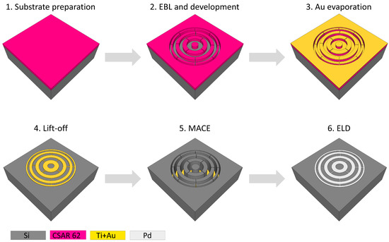 p-type, boron-doped Si (100) wafers with 1–5 cm resistivity were purchased from Si-Mat. CSAR 62, amyl acetate, and dimethyl succinate were purchased from Allresist. Hydrofluoric acid (HF, 40%) and acetone were procured from Merck. Hydrogen peroxide (HO, 31%) and isopropanol were from D-BASF. The PD-Tech PC electroless Pd system was purchased from Atotech. Ethanol and n-pentane were from VWR.