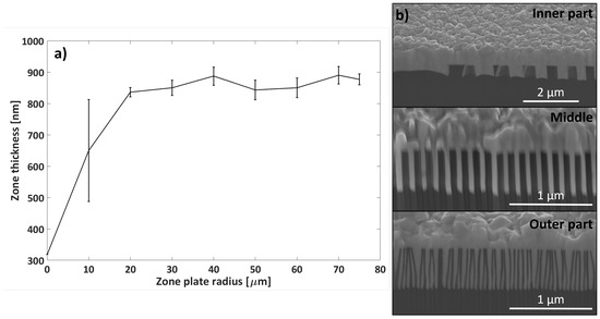 The decreasing zone widths resulted in a variation of zone thickness over the zone radius. The inner zones were wider than the outer zones and consequently relatively thin compared to the outer zones. In order to fill the zones fully with Pd via ELD, over-plating was unavoidable. The variation of zone thickness over the zone plate radius is presented in Figure 3a. The zone thickness variation was largest from the zone plate center to 20 m outwards. However, this variation was not a big concern for the final zone plate performance since, normally, a central stop is used. The zone thickness was uniform from 20 m to the outermost part of the zone plate, with a standard deviation of about ±30 nm. Cross-section SEM micrographs are presented in Figure 3b for the inner, middle, and outer parts of a typical Pd/Si zone plate. The tendency of non-vertical zones is visible for the 30 nm wide zones in the outer part, where the Si structures are slightly slanted.