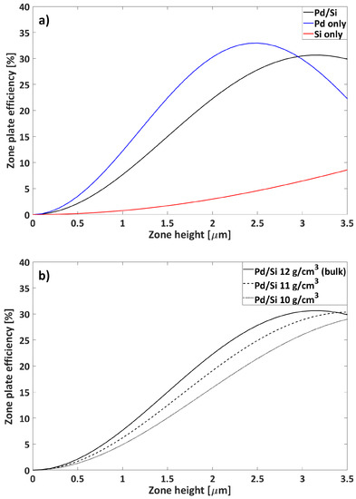 Zone plate efficiency at 9 keV as a function of zone height for (a) Pd/Si, Pd only, and Si only zone plates (bulk densities) and (b) Pd/Si zone plates with different Pd densities and bulk Si density. Calculations were done in MATLAB with GD-Calc.