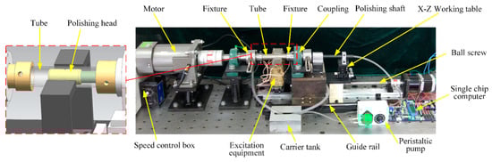The whole apparatus is as given in Figure 1. The tube is axially clamped by fixtures on two sides and left fixture is connected with an adjustable speed motor by coupling to drive the tube to rotate at high speed. For convenient disassembly of a workpiece, the coupling connecting to the right fixture is installed on the platform where a spacing sliding block is mounted. The guide rail matched with the spacing sliding block is fixed with the body frame so that the right fixture can be driven away from or approaching to the workpiece by moving the platform. The polishing head is merged with one end of the polishing shaft and put inside the tube. The space between the tube and the polishing head is saturated with MR polishing fluid, which gets stiffened under the action of excitation equipment. The neutral of polishing shaft can be controlled by the X–Z working table. The excitation equipment and the X–Z working table are bound to the ball screw driven by the stepping motor to do synchronous reciprocating linear motion and the speed is controlled by the single-chip computer. The carrier tank is installed to connect the two ends of tube to recycle the MR polishing fluid, which is stored in the carrier tank and delivered during the polishing process by the peristaltic pump.