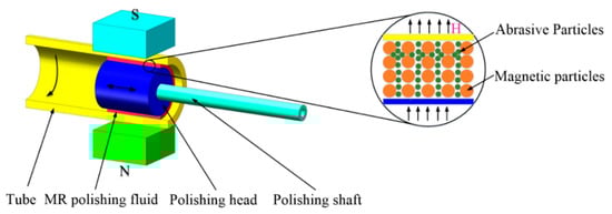 The MR polishing fluid was prepared by dispersing microsized magnetic particles and nonmagnetic abrasive particles into a water-based or oil-based medium. The reversible rheological properties of the MR polishing fluid under a magnetic field is substantially attributed to the magnetic particles, which carbonyl iron particles (CIPs) with high permeability and low hysteresis was selected as. However, the nonmagnetic abrasive particles actually played a leading role in removing the surface material. Diamond abrasive particles or SiC abrasive particles served as the nonmagnetic abrasive particles in the titanium-alloy tube polishing process; their polishing performance is discussed in the following section. To maintain the low apparent viscosity of the MR polishing fluid under a zero magnetic field, deionized water was selected as the base medium. Glycerol was added to the MR polishing fluid as a stabilizer to prevent the sedimentation of CIPs []. The specific parameter of the MR polishing fluid is given in Table 1.