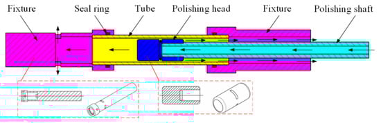 The polishing mechanism is shown in Figure 2. Excitation equipment is installed on the outside of the tube to let magnetic induction lines pass through the interior of tube. Under the action of an external magnetic field, magnetic particles are magnetized and aggregated into chains along the direction of the magnetic field, which is manifested in the macroscopic scale as stiffening of the MR polishing fluid. Nonmagnetic abrasive particles are embedded between the magnetic-particle chains [,] and connected with the inner surface of the tube to remove the material. When the magnetic field intensity increases, the connection between the magnetic chains also gets stronger leading to bigger yield shear stress of the MR polishing fluid, which means the rough inner surface is easier to polish. In such a situation, two-body abrasion mainly happens to the polishing abrasive particles and the tube surface and the polishing efficiency is relatively high. However, under a weaker magnetic field, the yield shear stress of MR polishing fluid reduces and insufficient shearing force is provided to polish. Three-body abrasion mainly occurs, which suggests low polishing efficiency. During the polishing process, the flexible polishing ribbon forms because of the solidification of the MRF polishing fluid under the external magnetic field and then moves in a synchronous reciprocating linear motion with the polishing head and the excitation equipment to cover the whole area to be polished. Meanwhile the tube keeps rotating at an appropriate high speed to shear the material. This polishing process is similar to the honing process and a spiral path is formed by the polishing particles on the inner surface of the tube. In this paper, the circulation system of the MR polishing fluid was designed as demonstrated in Figure 3. The arrows indicate the flow direction of the MR polishing fluid, which is pumped into the interior of the polishing head through the hole in the polishing shaft. Rectangular holes are uniformly distributed along the circumferential direction of the polishing head, allowing the MR polishing fluid to flow into the polishing area between the internal surface of the tube and the polishing head. Under a magnetic field, owing to its continuous delivery, the MR polishing fluid with small apparent viscosity and yield stress runs from the polishing area to both ends of the tube; the MR polishing fluid is collected from both ends of the tube, and thus it continues participating in the MR polishing process. In this way, the proposed MR polishing device completes its task of polishing the inner surface of titanium tubes and recycles the MR polishing fluid. It is noted that the MR polishing fluid will be circulated only when polishing the same one titanium alloy tube. Since the abrasive particles are damaged after multiple cycles, the MR polishing fluid will not participate in the polishing of the next tube. If another workpiece needs to be polished, the MR polishing fluid will be replaced with a new one.