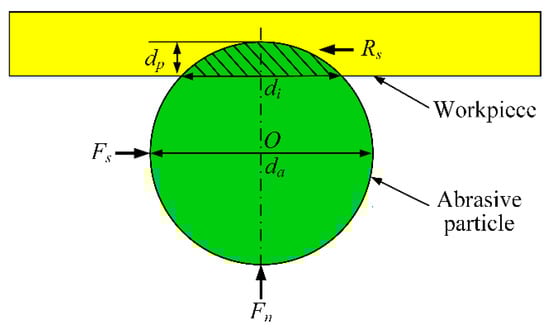 The forces applied to a single abrasive particle during the polishing process are shown in Figure 4. While the abrasive particle is working, it will be pressed into the workpiece surface under the pressure force Fn forming an indentation with the depth of dp (refer to Equation (3)), and pushed by shear force Fs to polish. The abrasive particle will be accordingly obstructed by the obstructing shear action Rs (see Equation (1)) generated by the workpiece surface. So, Rs and Fs are a pair of opposite forces. Different numerical values of Rs and Fs will lead to different effects. Fs is the shear force applied by the magnetic particle chains. When Fs > Rs, the abrasive particle held by the magnetic chains can remove the surface material; however, when Fs < Rs, the magnetic chains may not provide enough shear force to remove the surface material, leading the abrasive particle to roll on the workpiece surface, which makes the polishing behavior inefficient or even prevents the polishing behavior from happening. Therefore, by comparing Fs and Rs, whether the polishing action can be carried out smoothly can be known. Otherwise, moderate adjustments should be conducted properly.