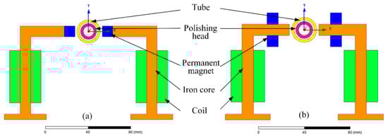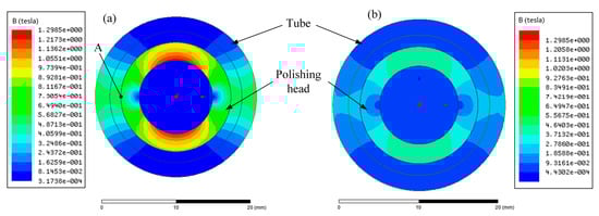 The finite element software ANSYS Maxwell was used to simulate the static magnetic field based on the two types of excitation equipment. The distribution of magnetic flux density inside the tube when the excitation current was 2 A is shown for layout α and layout β in Figure 6a,b, respectively. The magnetic flux density for layout α was approximately 0.5 T; however, the magnetic flux density for layout β was approximately 0.2 T. It was observed that the magnetic flux density inside the polishing head was close to 0 T in both types of excitation equipment, which implies that the flow of the MR polishing liquid inside the polishing head was not affected by the magnetic field. This can be attributed to the fact that the polishing head was made using a ferromagnetic material, which can shield the magnetic field.