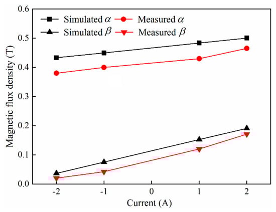 For further comparison, point A in Figure 6a was elected as a reference point. Figure 7 illustrates the magnetic flux density of point A in layout α and layout β under different excitation currents. The variation in the magnetic flux density with respect to the excitation current was the same for both types of excitation equipment. When the excitation current was positive, the compound magnetic field strength increased with an increase in excitation current. However, when the excitation current is negative, the compound magnetic field strength is expected to decrease with an increase in excitation current. This can be explained by the fact that the magnetic field directions of the electromagnetic and the permanent magnet are the same under a positive excitation current but opposite under a negative excitation current. Apparently, when the same excitation current is applied, the magnetic flux density of point A in layout α is much larger than that in layout β, whereas the gradient of magnetic flux density varying with the excitation current in layout α is smaller than that in layout β. This phenomenon is a result of the dominance of magnetic flux density generated by the permanent magnet in layout α, whereas in layout β, the magnetic flux density generated by the electromagnet is dominant.