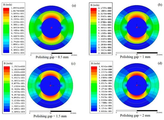 The distance between the inner wall of titanium alloy tube and the polishing head directly affects the magnetic field strength within the polishing area. To find the appreciate polishing gap, the magnetic field simulation test were conducted with the polishing gap of 0.5 mm, 1.0 mm, 1.5 mm, and 2.0 mm respectively. The influencing rule of polishing gap on the magnetic field strength in the polishing area is shown in Figure 9: The magnetic field strength in the polishing area is inversely proportional to the size of the polishing gap. When the polishing gap increases from 0.5 to 2.0 mm, the maximum magnetic induction intensity in the polishing area decreases from 0.6 to 0.3 T. Although an appropriate magnetic field strength can make the polishing efficiency reach the expectation, the polishing gap of 1.5 mm between the polishing head and the internal surface of the tube would be applied considering the influence of polishing gap on magnetic field, size of abrasive chain and MR fluid flow.