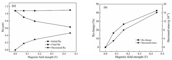Effects of magnetic flux density on polishing performance: (a) surface roughness and (b) percentage change in surface roughness and decreased material mass.