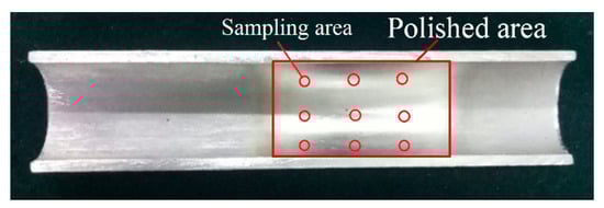 As shown in Figure 8, the experiments were performed with the titanium-alloy tubes (22 mm outer diameter, 18 mm inner diameter, 100 mm long). In consideration of the deviation of the initial surface roughness, specimens with similar initial surface roughness were selected for the same group of MR polishing experiments. Four groups of experiments were conducted to investigate the effect of compound magnetic field strength, rotation speed, type of abrasive particles, and concentration of abrasive particles on the polishing performance, with specific polishing conditions summarized in Table 2 and Table 3. In order to distinguish the polished areas and unpolished areas more clearly in the same tube, partial polishing of the internal surface of the tube was necessary. Hence, the reciprocating stroke was set as 10 mm to polish a specified section of tube. The reciprocating linear speed was set as 8 cycles per minute and the total number of cycles was 675.