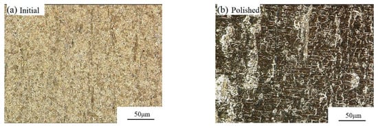 Optical microscope images of the polished surface at 1500 × magnification: (a) before and (b) after being polished.