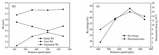 Effects of rotation speed on polishing performance: (a) surface roughness and (b) percentage change in surface roughness and decreased material mass.