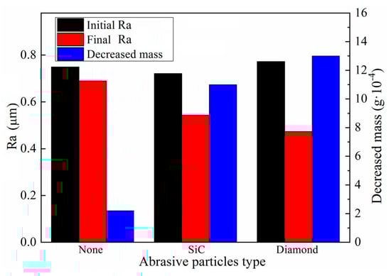 Experiments to assess the role of the abrasive particles in MR polishing and to select the most appropriate type of abrasive particles for polishing titanium alloys were carried out, according to Test No.3 in Table 3. The size of abrasive particles used here in this section is claimed in Table 1 (Diamond Φ20 µm, SiC Φ25 µm). Titanium-alloy tubes with initial surface roughness in the range of Ra 0.721–0.772 μm were selected as specimens and different kinds of MR polishing fluids were prepared. The experimental results are exhibited in Figure 14. When abrasive particles were not added to the MR polishing fluid, only subtle variations of surface roughness and material mass were noticed. The initial surface roughness decreased from Ra 0.749 to Ra 0.689 μm after 675 cycles, and the removed material mass was only 0.0004 g. Due to the use of a non-abrasive particle in the MR polishing, abrasion action only occurred between the CIPs and the machined material surface, which explains the low polishing efficiency. Adding abrasive particles to the MR polishing fluid obviously promoted variations in the surface roughness and material mass. Compared with SiC, diamond abrasive particle performed much better. The surface roughness and material mass were reduced by Ra 0.299 μm and 0.0013 g, respectively, with diamond but only by Ra 0.178 μm and 0.0011 g, respectively, with SiC. Therefore, diamond abrasive particles with high hardness are much more appropriate for finishing titanium-alloy tubes in terms of polishing performance.