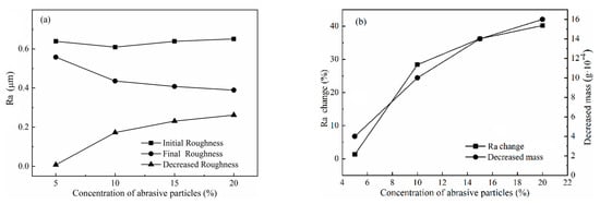 Effects of the volume of abrasive particles on polishing performance: (a) surface roughness and (b) percentage change in surface roughness and decreased material mass.