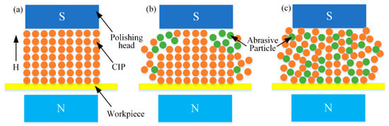 Distribution of particles in the MR polishing fluid under a magnetic field: (a) no abrasive particles, (b) low concentration of abrasive particles, and (c) high concentration of abrasive particles.