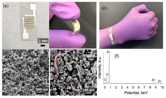 (a) Optical images of the fabricated sensor; (b,c) demonstrating the flexibility of the sensor; (d,e) scanning electron microscope (SEM) image of the sensing material at different magnification; and (f) elemental dispersive X-ray spectroscopy (EDX) of the sensing material showing the elemental composition.
